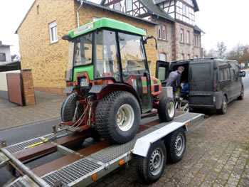 Der NABU -Traktor bei der Verladung für dem Weg zum Arbeitseinsatz am Mausohr-Bahnhof (Bild: Dirk A. Diehl). |