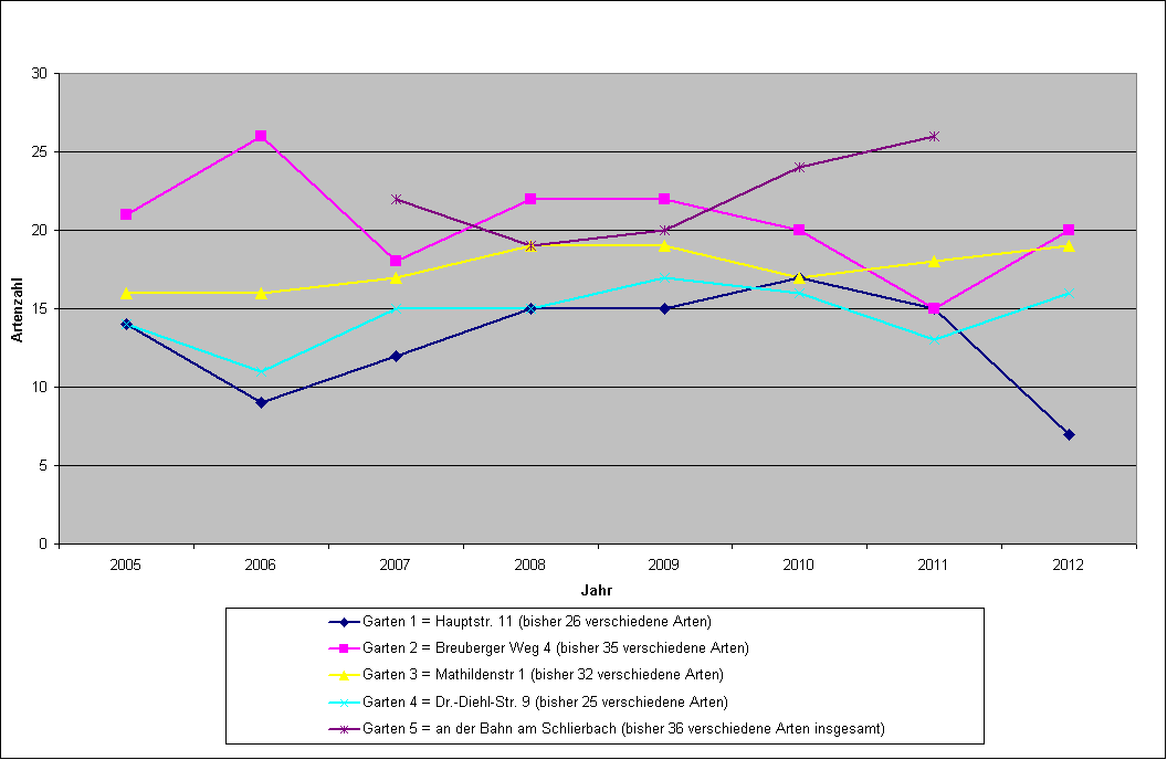 Im Rahmen der Stunde der Gartenvögel wurden in den Gärten 7 bis 26 Arten ermittelt. Erwartungsgemäß sind die Artenzahlen abhängig von der Lage und Struktur der Gärten. Die Gärten mit den geringsten Artenzahlen sind Garten 1 (dunkelblaue Linie) und Garten 4 (hellblaue Linie). Das ist leicht zu erklären bei Garten 1: er liegt mitten im dicht bebauten alten Ortskern und bildet gewissermaßen eine Oase in der "Stein- und Fachwerkwüste". Nicht so einfach ist das bei Garten 4 zu erklären. Sicher ist die Artenzahl etwas unterrepräsentiert; der Garten ist klein und von einer dichten Hecke umgeben. Das schränkt den Blick ein und erschwert die Beobachtung. Allerdings überwiegt im Umfeld intensive Gartenbewirtschaftung. Hohe Werte liefert Garten 5 (violette Linie), der am Ortsrand gelegen am wenigsten Störungen aufweist. Das ist ein Problem in Garten 2 (rosa Linie): Zeitweise starke Aktivitäten von Katzen wirken sich ungünstig auf den Vogelbestand aus. Mit einer mittelhohen Artenzahl ist Garten 3 (gelbe Linie) einzuordnen. Dieser Garten profitiert auch von seiner Nachbarschaft zum Friedhof, wo einige Altbäume als Nist- und Nahrungsraum zur Verfügung stehen. Die dort brütenden Arten nutzen diesen Garten mit. | ||||||||||||||||||||||||||||||||||||||||||||||||||||||||||||||||||||||||||||||||||||||||||||||||||||||||||||||||||||||||||||||||||||||||||||